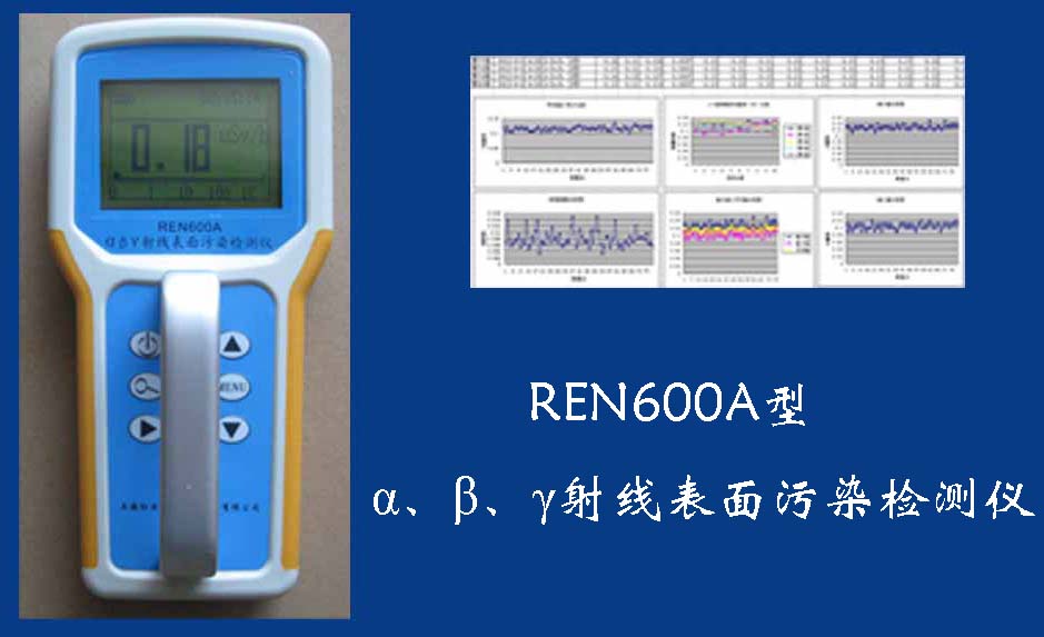 REN600A型α、β、γ射線表面污染檢測儀即可檢測α、β、γ射線,也能檢測到X射線,它采用高速嵌入式微處器作為數(shù)據(jù)處理單元,點陣式大屏幕LCD液晶顯示,讀數(shù)清晰、操作方便,具有400條超大容量數(shù)據(jù)存儲。儀器采用進口的大面積MICA蓋革探測器,具有較高探測效率,可進行α、β輻射表面污染檢測和X、γ輻射劑量率的監(jiān)測。此外通過配套的RenriCont表面污染管理軟件可將存儲的數(shù)據(jù)讀出后分析。可廣泛用在制藥廠、實驗室、發(fā)電廠、進出口商檢、采石場、環(huán)境實驗室、環(huán)境污染調查、核安全應急、緊急狀況營救站、金屬處理廠、地下油田、供油管道裝備、醫(yī)院核醫(yī)學科、同位素實驗室、環(huán)境保護和警察局等部門。REN600A型α、β、γ射線表面